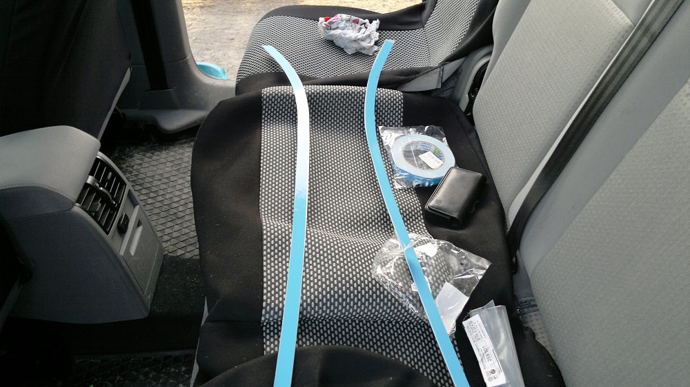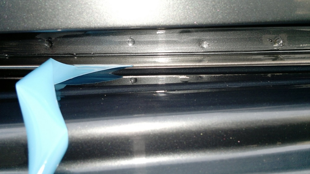 Далее наклейте скотч на накладку. Накладку (саблю) устанавливать лучше вдвоём, так как она довольно гибкая (а в случае с Transporter она еще и длинная) и норовит приклеиться раньше времени. Аккуратно, без спешки, потренируйтесь устанавливать накладку пока скотч ещё на подложке или еще нет герметика.